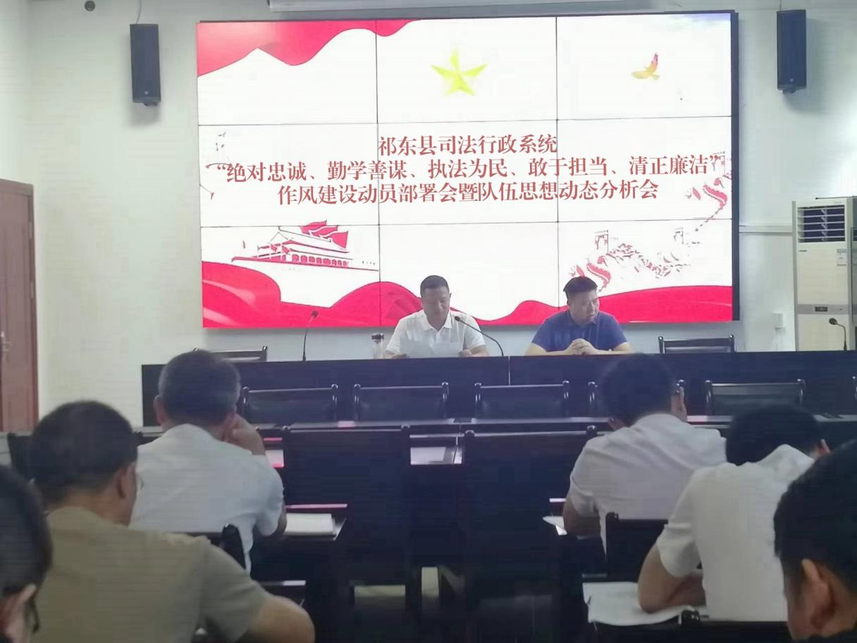 9月12日,祁东县司法行政系统召开“绝对忠诚、勤学善谋、执法为民、敢于担当、清正廉洁”作风建设动员部署会暨队伍思想动态分析会。会议以习近平新时代中国特色社会主义思想为指导,深入贯彻落实党的二十大精神和主题教育“学思想、强党性、重实践、建新功”总要求,全面分析研判队伍思想动态、研究部署思想政治工作,为深入推进“五警”建设,推动全县司法行政工作高质量发展提供政治思想保证和组织保证。县司法局党组书记肖轲出席会议并讲话,县司法局党组成员、政工室主任刘欣主持会议,并对作风建设工作作部署。