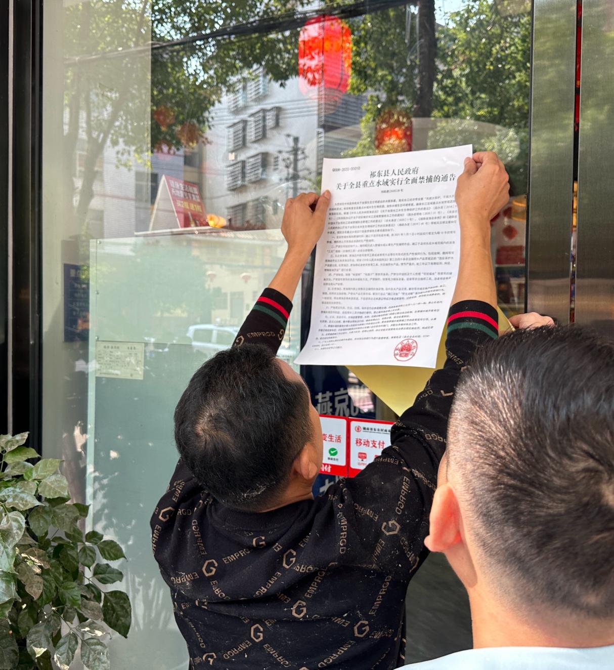 活动中,工作人员深入辖区饭馆、酒楼、渔具店等场所,检查饭馆、酒楼是否有拉运、储存、贩卖青鱼、草鱼等主要伤害鱼类的行为;检查渔具店是否有售卖"地笼网""布围子"等禁用渔具,并向他们发放禁渔手册、地笼类渔具规范使用告知书和《祁东县人民政府关于全县重点水域实行全面禁捕的通告》,呼吁大家自觉遵守禁渔规定,共同保护流域生态环境。