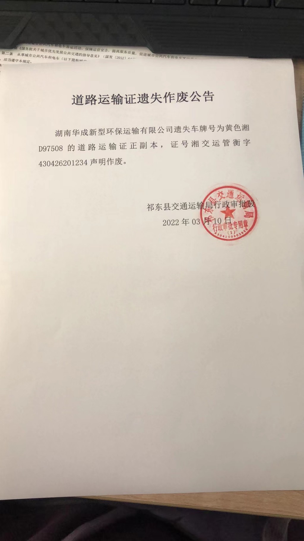 湖南华成新型环保运输有限公司遗失车牌号为黄色湘D97508的道路运输证正副本,证号湘交运管衡字430426201234声明作废。