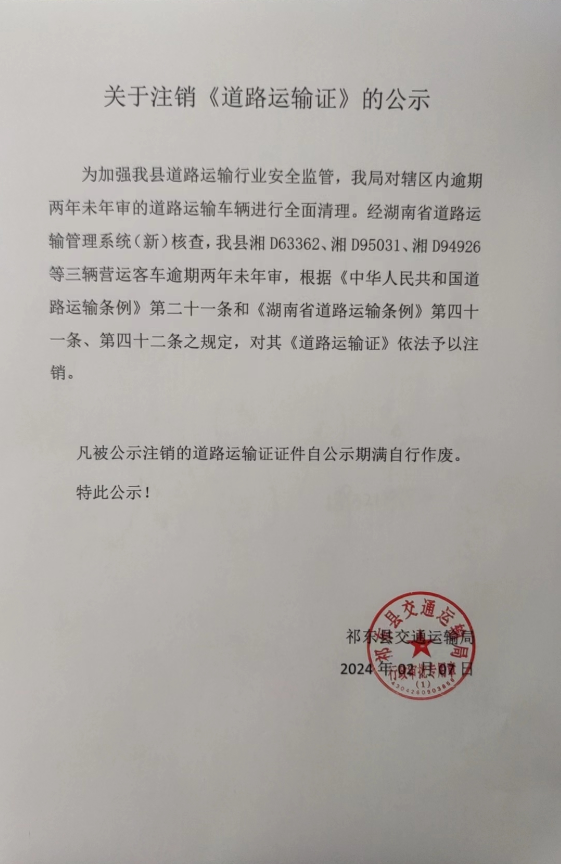 关于注销《道路运输证》的公示