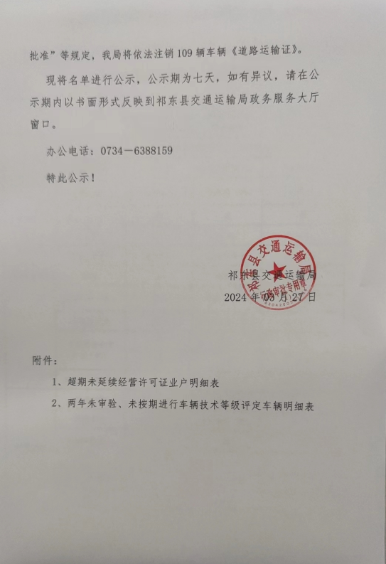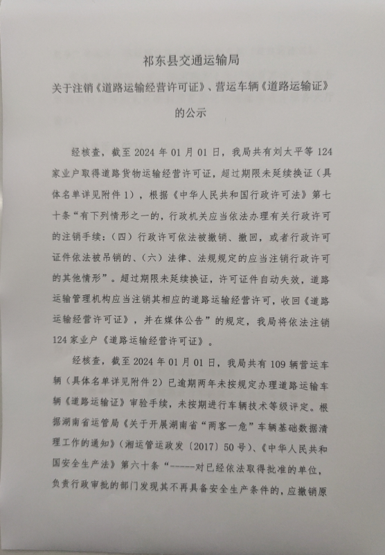 关于注销《道路运输经营许可证》、营运车辆《道路运输证》的公示