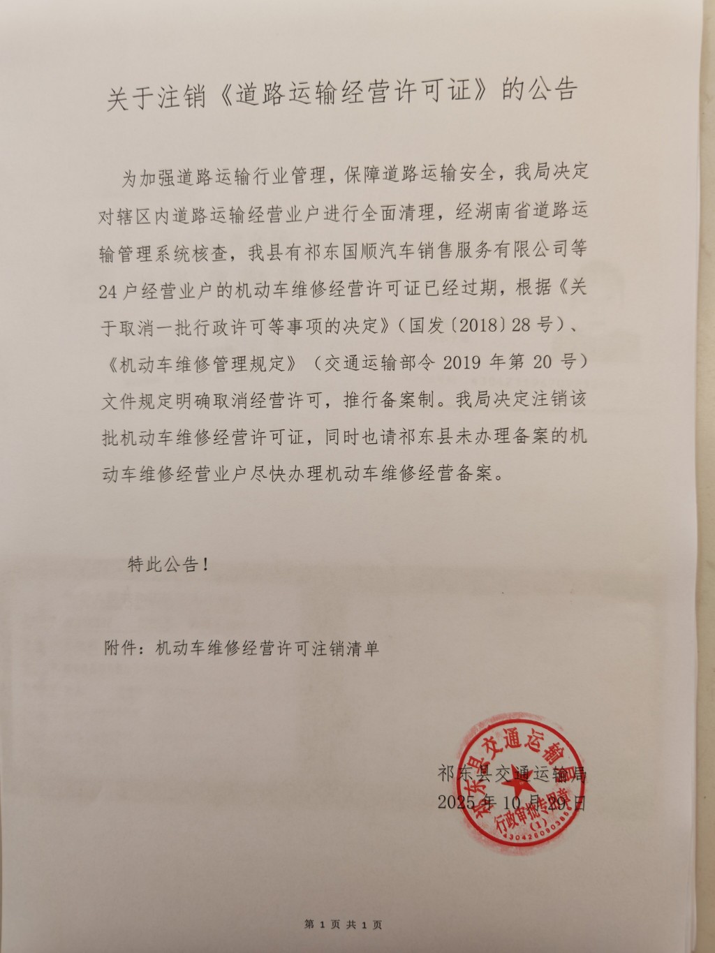 关于注销《道路运输经营许可证》的公告