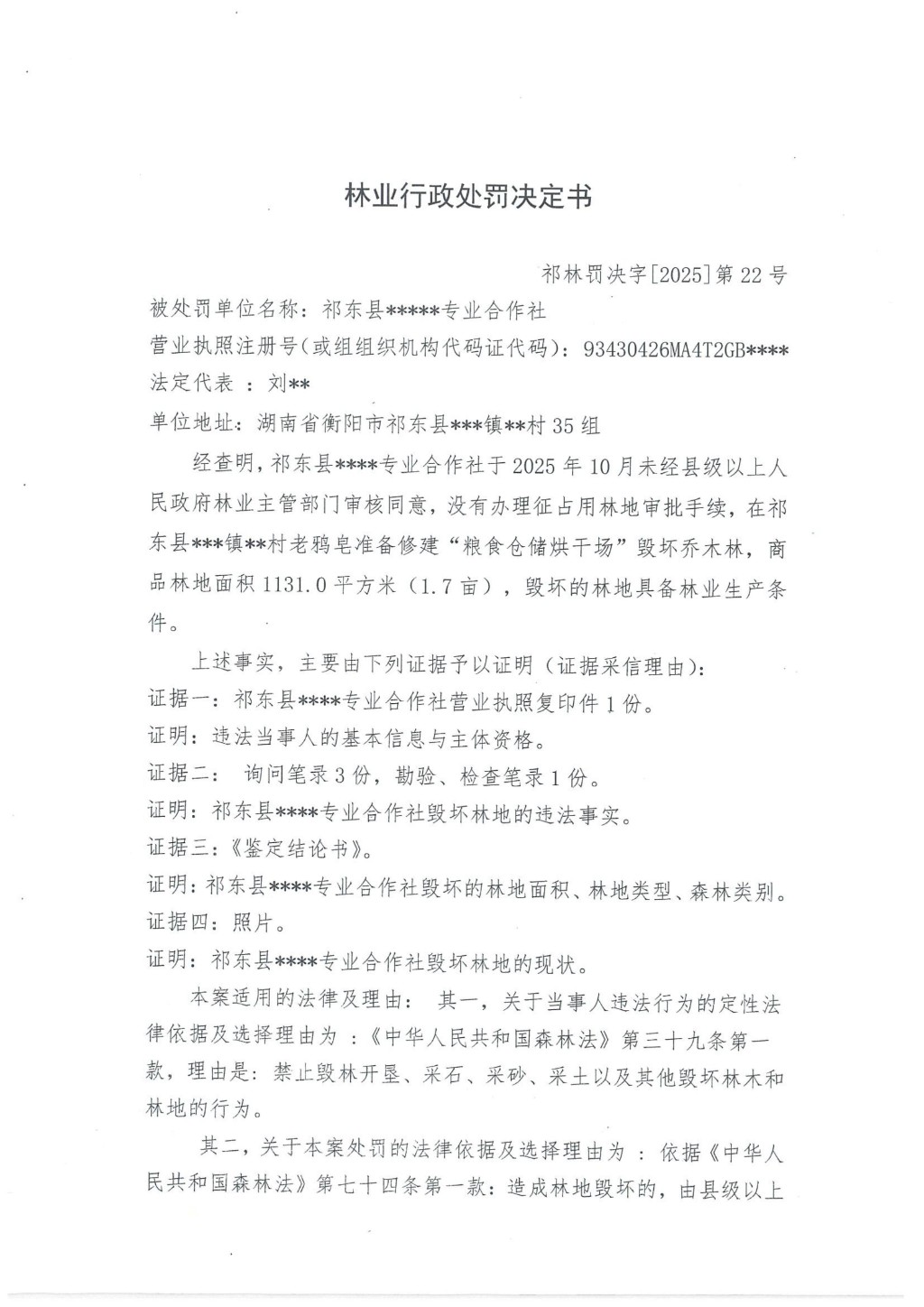 林业行政处罚决定书(祁林罚决字【2025】第22号)公示