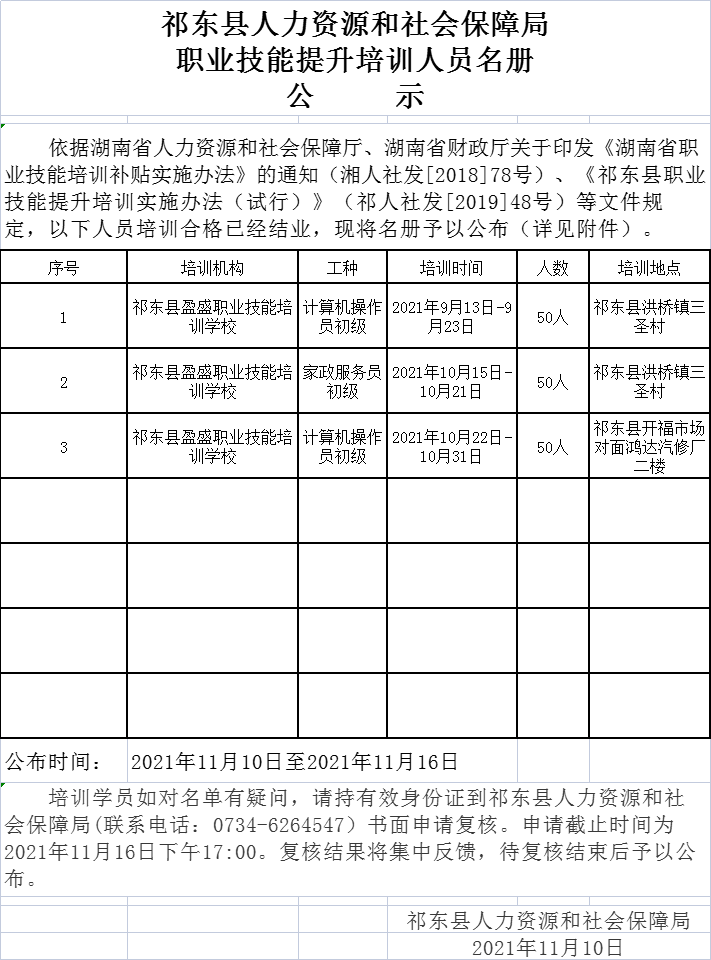 祁东县人力资源和社会保障局职业技能提升培训人员名册公示(第七批)