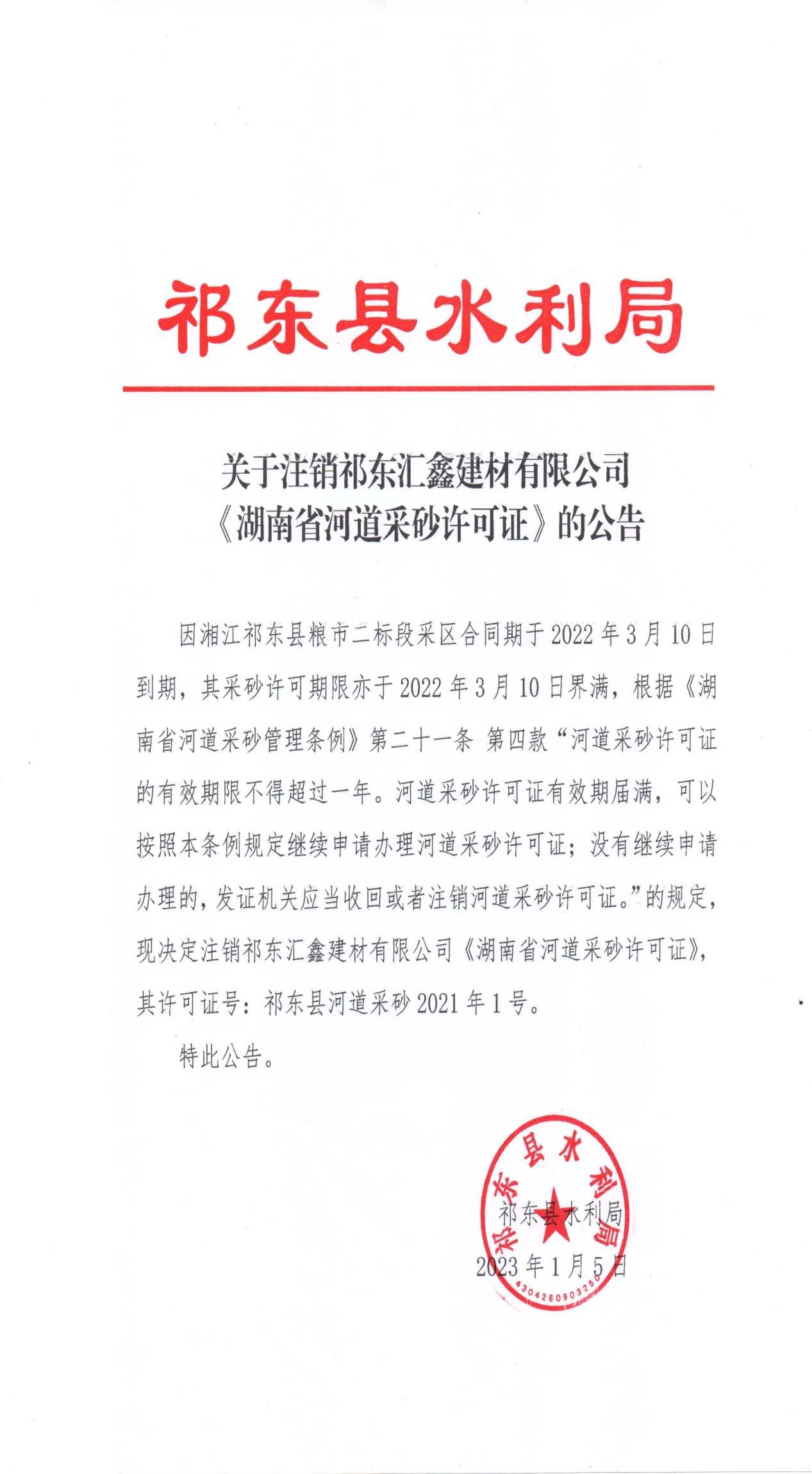 关于注销祁东汇鑫建材有限公司《湖南省河道采砂许可证》的公告