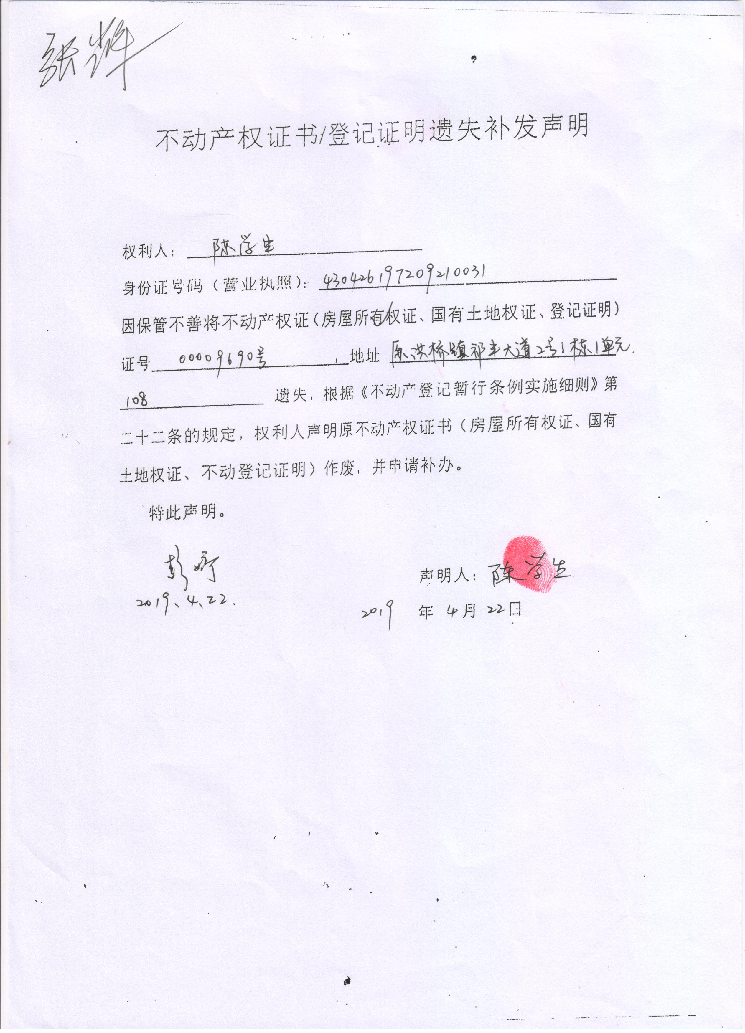 关于陈学生不动产权证书/登记证明遗失补发声明