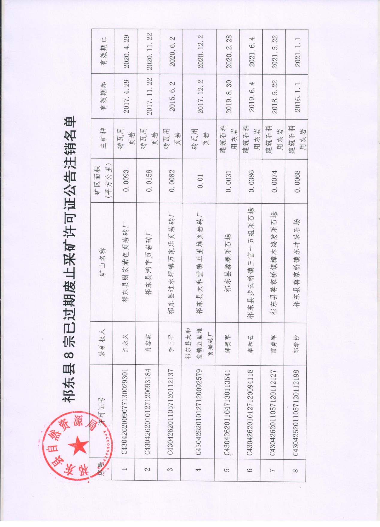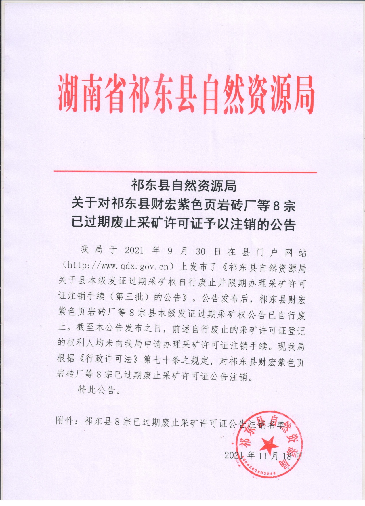 祁东县财宏紫色页岩砖厂等8宗已过期废止采矿许可证予以注销的公告
