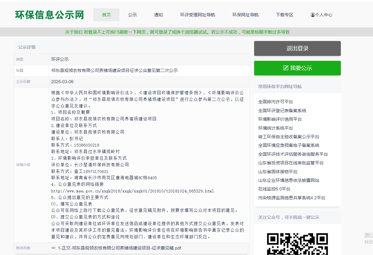 根据《环境影响评价公众参与办法 生态环境部令 第4号》第九条要求建设单位应当在确定环境影响报告书编制单位后7个工作日内,通过其网站、建设项目所在地公共媒体网站或者建设项目所在地相关政府网站(以下统称网络平台)公开相应信息。我单位于2025年3月3日在全国建设项目环境信息公示平台上进行第一次网上公示(网址:https://gongshi.qsyhbgj.com/h5public-detail?id=443202),公示截图见图1所示。